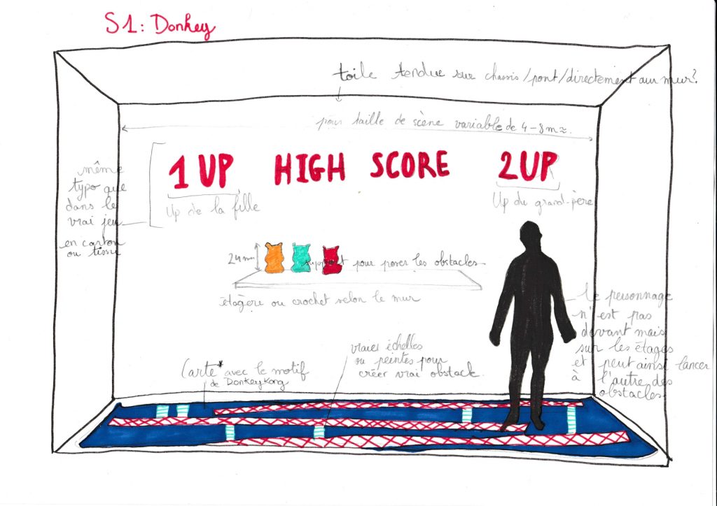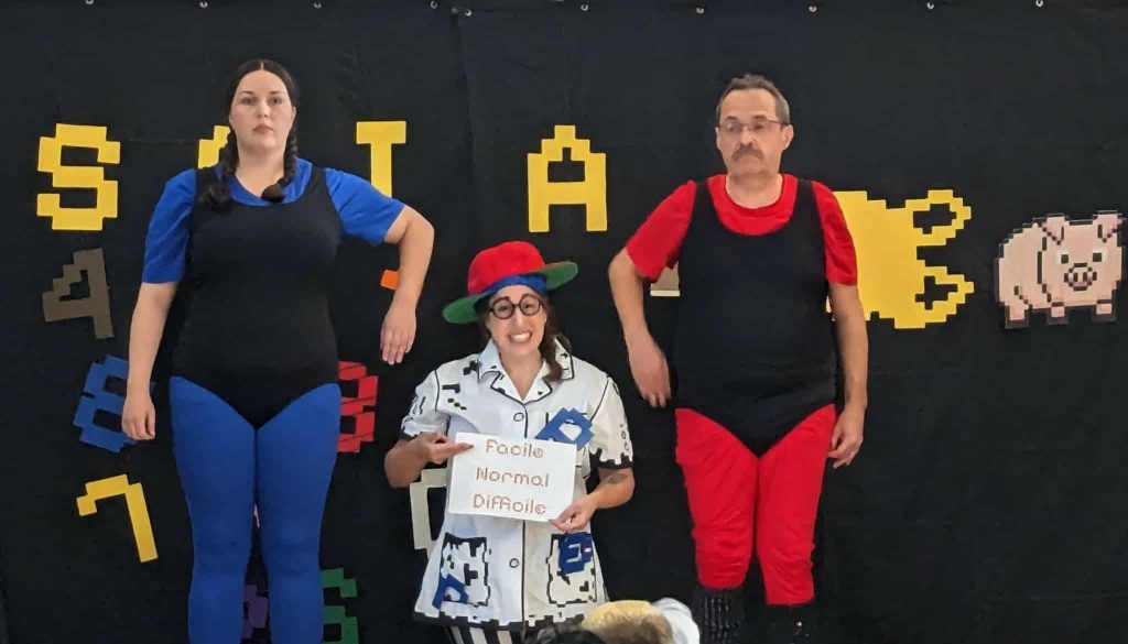 La scénographie adopte un univers en 2D, haut en couleur, évoquant l’esthétique des premiers jeux vidéo. Inspirée des références du rétrogaming, elle plonge les spectateurs dans une ambiance dynamique et ludique, où les décors se transforment au fil de l’aventure des personnages. Ce choix visuel renforce l’immersion et fait écho aux souvenirs des générations qui ont grandi avec ces références culturelles.