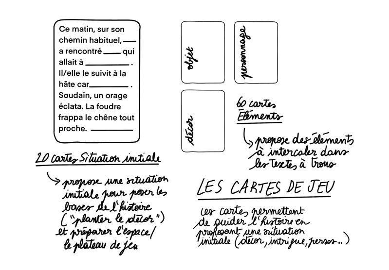 Chaque participant·e commence par piocher une carte “Situation” à compléter à l’aide d’éléments choisis (personnages, objets, espaces), puis construit un mini-décor et donne vie à son histoire comme dans un petit théâtre.