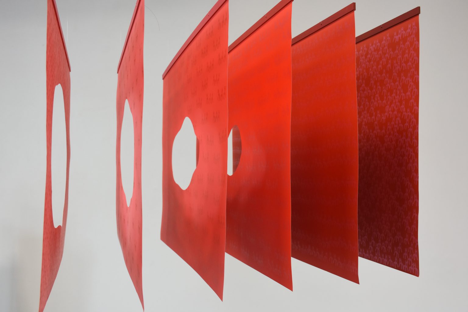 Installation suspendue, six monotypes rehaussés de tampons dans des nuances de rouge, 92x65cm